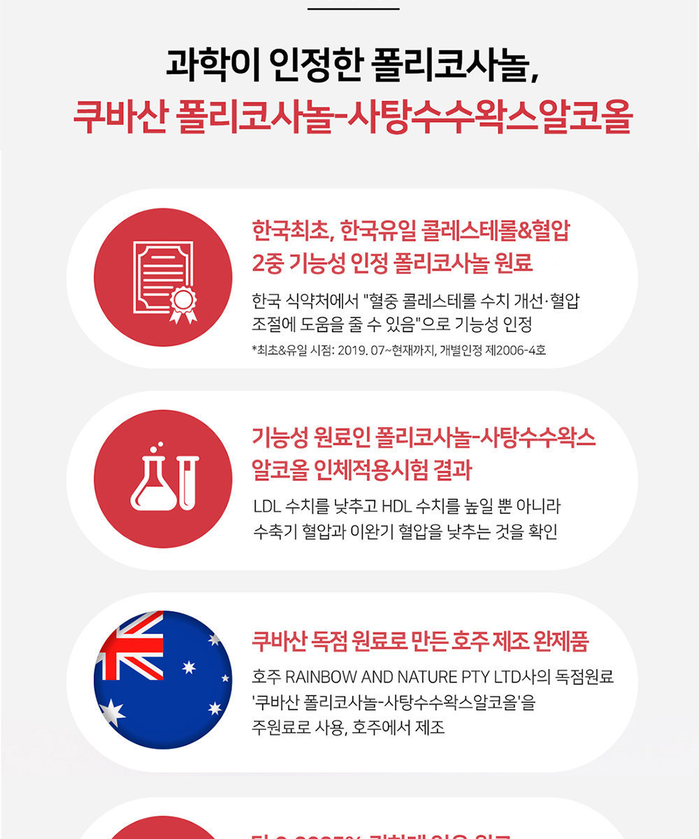 그중에서도 쿠바산 폴리코사놀은 특별해요. 쿠바 정부 산하 연구소에서 오랜 연구 끝에 개발된 원료로, 쿠바 사탕수수에서 추출되는데요. 전 세계적으로 그 기능성과 안전성을 인정받고 있어요. 사탕수수 100톤에서 겨우 2.5kg만 얻을 수 있는 아주 귀한 원료라고 하니, 정말 대단하죠? 사탕수수에서 찾은 콜레스테롤 청소부 '폴리코사놀'에 대해 더 궁금하시다면 여기를 눌러보세요.