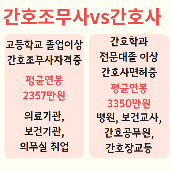 물론 각각의 가치관에 따라 돈보다는 환자의 건강 회복과 유지를 동원해서 의료활동의 행복감과 4명함으로 업무를 진척할 수 있다고하지만 연봉과 그리고 자신의 비전도 절대 내려다 볼 수 없는 문제이라고 합니다. 또한 간호조무사의 경우 말씀드린 것 같은 의료적인 활동을 하는 잡일을 하는 느낌이 많이 듭니다.그리하여 간호조무사로서 가능한 부분적인 일보다 더 많은 전문적인 의료적인 일을 해보고 싶기 때문에 많은 분들이 간호사를 되고 싶어 하십니다.