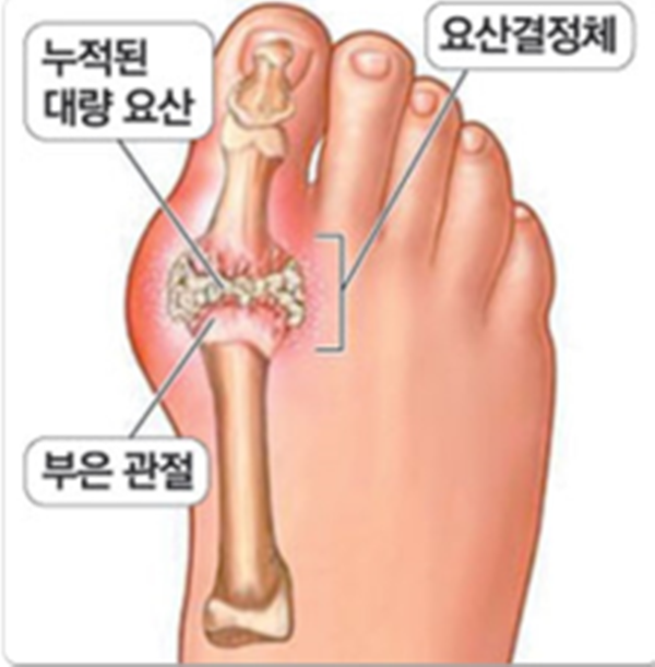 그렇지만 이 요산이라고 불러내는 물질이 몸 안에 무척치게 쌓인다면 결부진으로 변해서 몸 안에 뭉치게 된다고 하는데요. 요산 결단체들이 관절과 장기에 쌓이면 큰 염증과 통증을 일으키는데, 그게 바로 통풍인 것이죠.