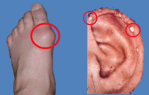 4) 엄지 발가락 관절에 염증이 수시로 출현하고라고요. 그리고 발, 무릎, 손목, 발목, 팔꿈치에도 관절염이 발생합니다.