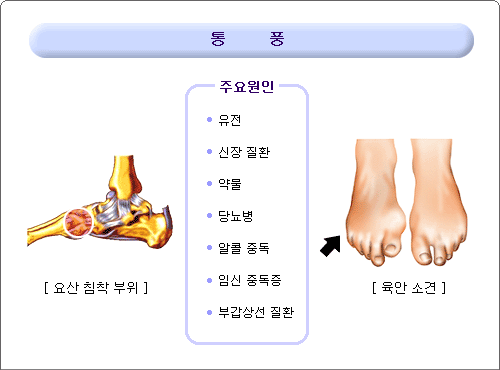 이번에는 통풍의 의학적인 정의에 대하므로 둘러보겠습니다 통풍은 요산이라고 부르는 이름의 물질이 소변을 통해서 사람의 몸에서 못 빠져나오게 되고, 그 결과 요산이과하게 축적되어 관절에 염증을 생성해 주는 질병이고요. 바람만 맞아도 엄청 아픈 것 같다고 해서 '통풍'이라는소환하는 이름이 붙었다고 하더라고요.